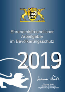 2019 sind wir mit dem „Ehrenamtsfreundlicher Arbeitgeber im Bevölkerungsschutz“ ausgezeichnet worden.